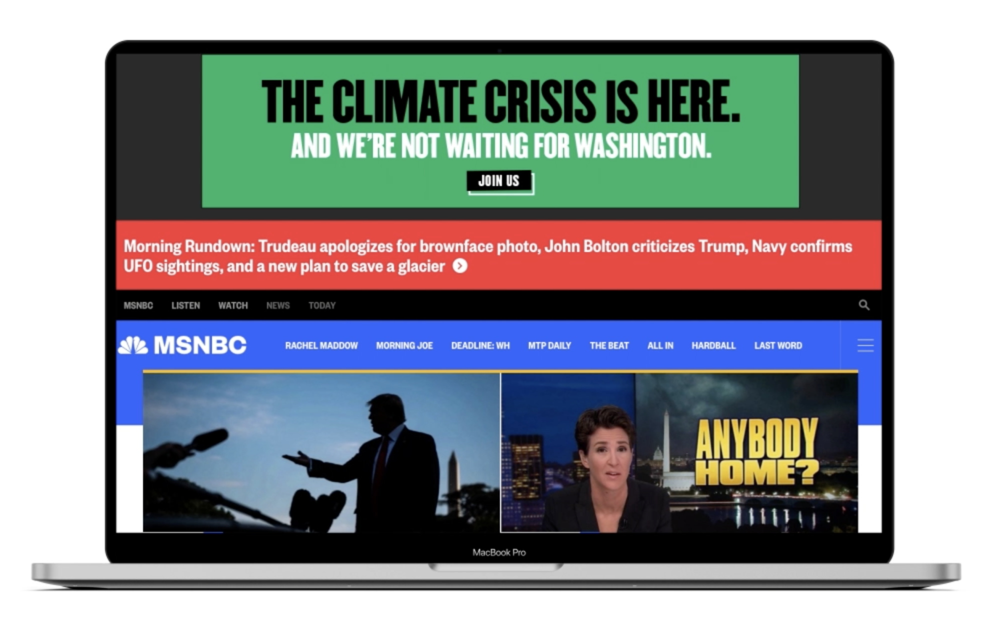 We appealed to those looking for progress with personalized messaging about what their states were doing and how they could help, and a punchy, protest poster style. The MSNBC.com takeover featured an especially native design, starting with newsworthy climate change imagery perfectly at home with any climate news story, before revealing our messaging.